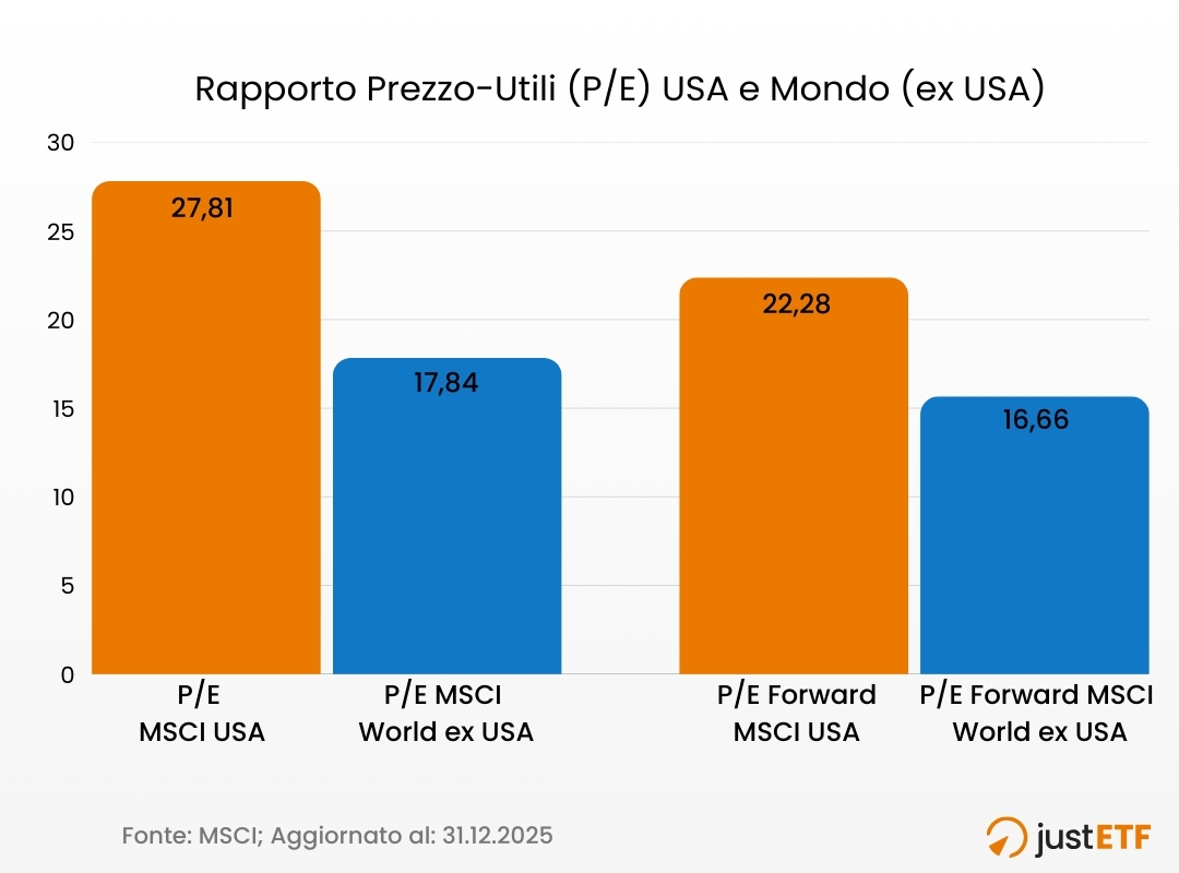 → Mondo (ex USA): Il resto del mondo sviluppato viaggia su valutazioni moderate, con un P/E di 17,8.