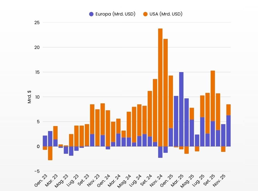 Nel solo mese di febbraio, l'azionario europeo ha segnato i flussi mensili più elevati della sua storia, sostenuto da ingressi settimanali nell'ordine dei 10 miliardi di dollari.